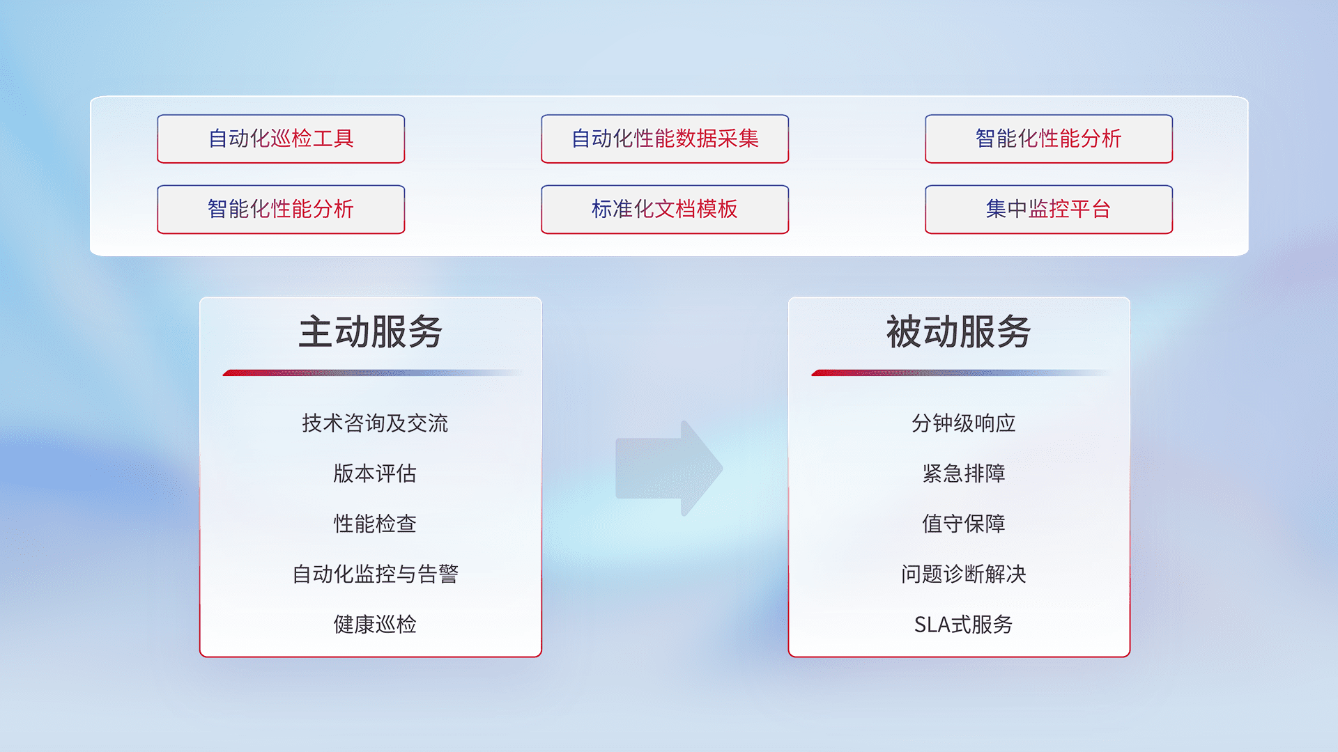 智能化工具和标准化文档,,,,保障服务质量,,提供主动服务(包含技术咨询、、、、版本评估、、、、性能检查、、自动化监控与告警、、、、健康巡检)和被动服务包含(分钟级响应、、、紧急排障、、、、值守保障、、问题诊断解决、、、SLA服务)。。。。